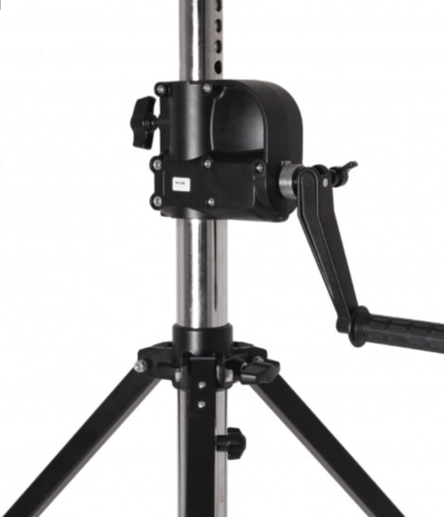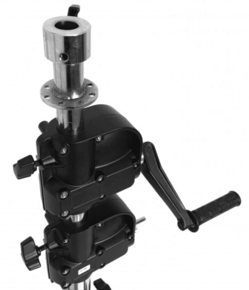O pino de segurança será inserido automaticamente no orifício do tubo quando o enrolamento engatar, a parte superior do suporte é montada por um parafuso de aço através do tubo superior que garante uma montagem robusta e sólida, posição de desbloqueio a mola interna trará o pino de segurança de volta, a manivela dobra para trás para viagem. Ele também pode ser colocado entre as pernas do tripé para evitar que os tirantes caiam acidentalmente se a trava for inesperadamente desengatada, a tensão da sapata do freio pode ser ajustada com uma chave Allen,